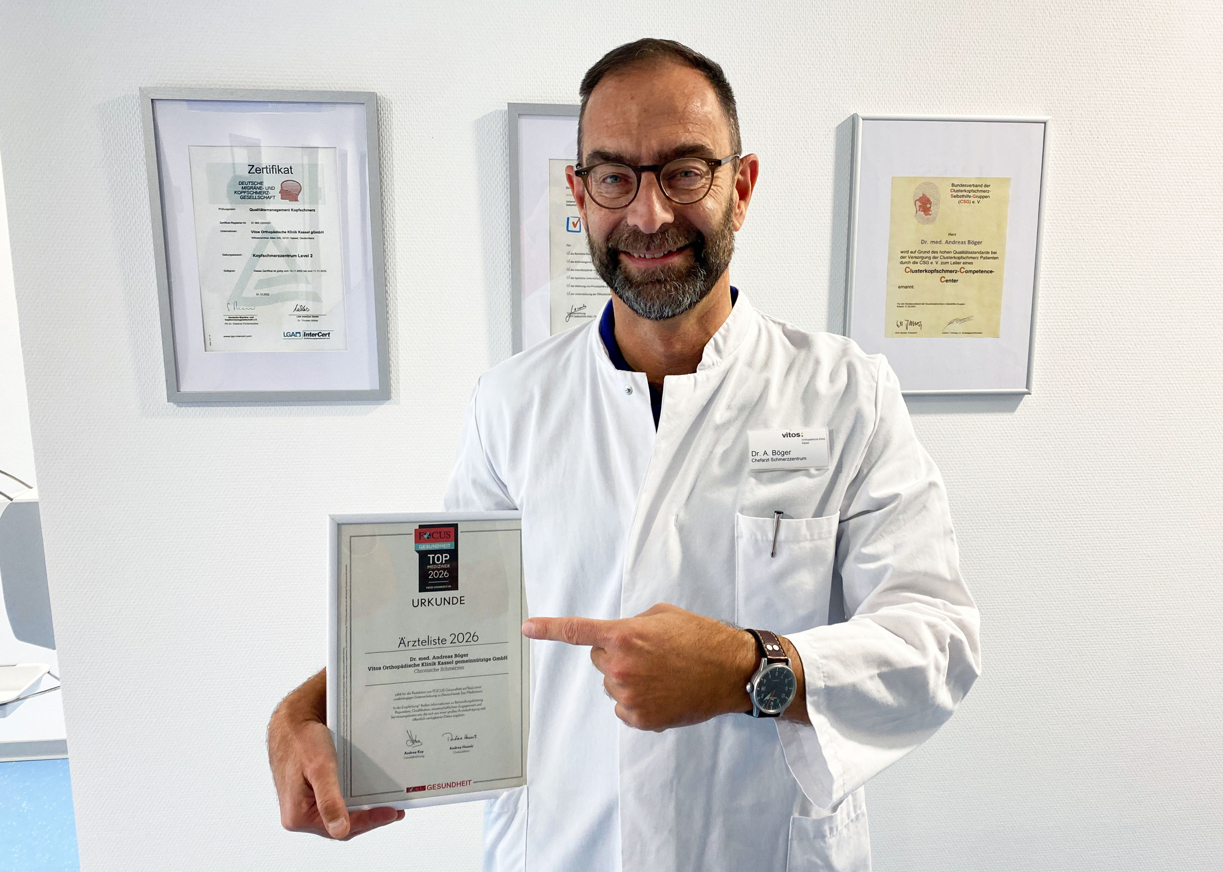 Gute Nachrichten für Kopfschmerzpatienten in Kassel und der Region: Die Deutsche Migräne- und Kopfschmerzgesellschaft DMKG hat das Kopfschmerzzentrum Kassel für „exzellente Behandlungsqualität“ ausgezeichnet. „Deutschlandweit sind wir damit als einziges Haus auf dem Level II-Niveau zertifiziert“, sagt Chefarzt Dr. Andreas Böger, der Leiter des Schmerzzentrums..